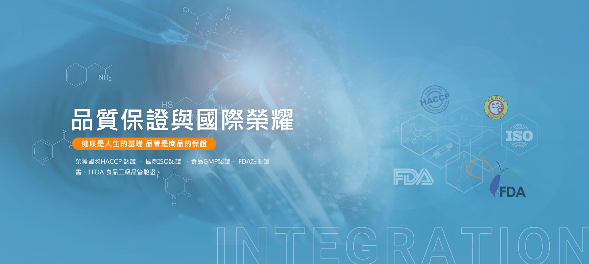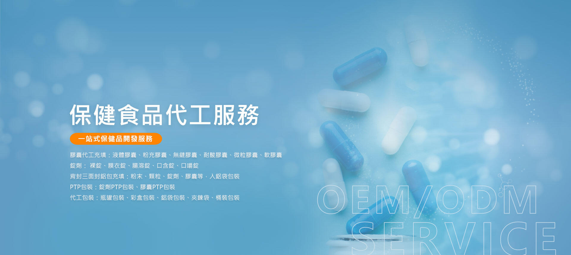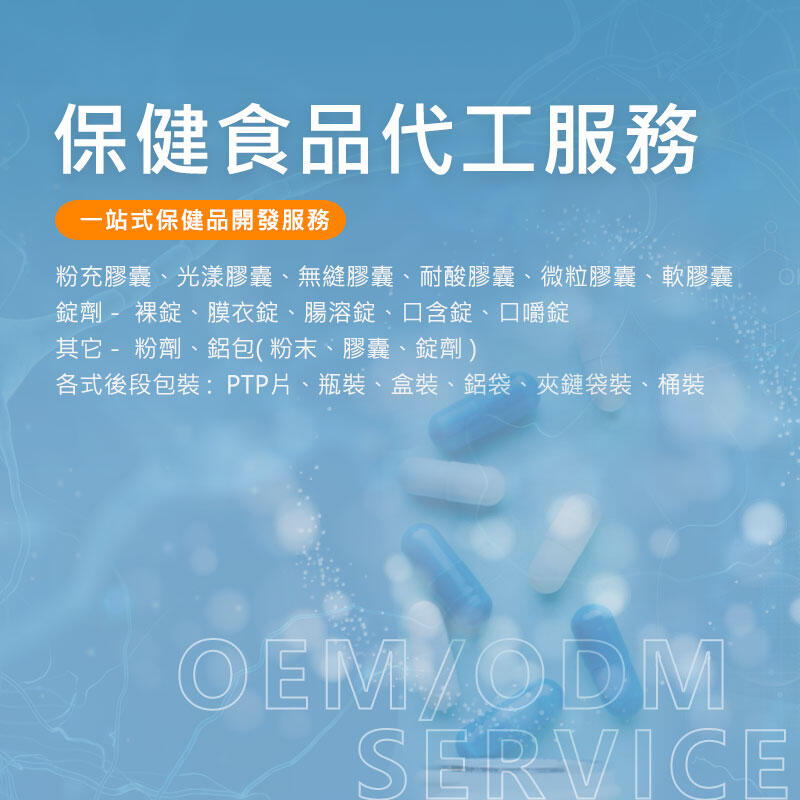 採取cGMP作業精神,結合專業技術並以ISO、HACCP、GMP國際化控管,執行保健食品OEM/ODM代工服務,希望以「極致創新、專業整合、服務健康」理念,創造食品無限價值。